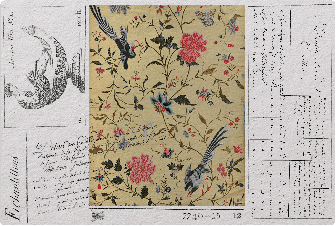 Source de l’image: « Lampas 2 lats nué lancé par Séchan tiré d’une peinture japonaise. » par la Maison Le Mire – 1869 – Isabelle Bideau, Mobilier national – Dernière mise à jour ici, janvier 2019.