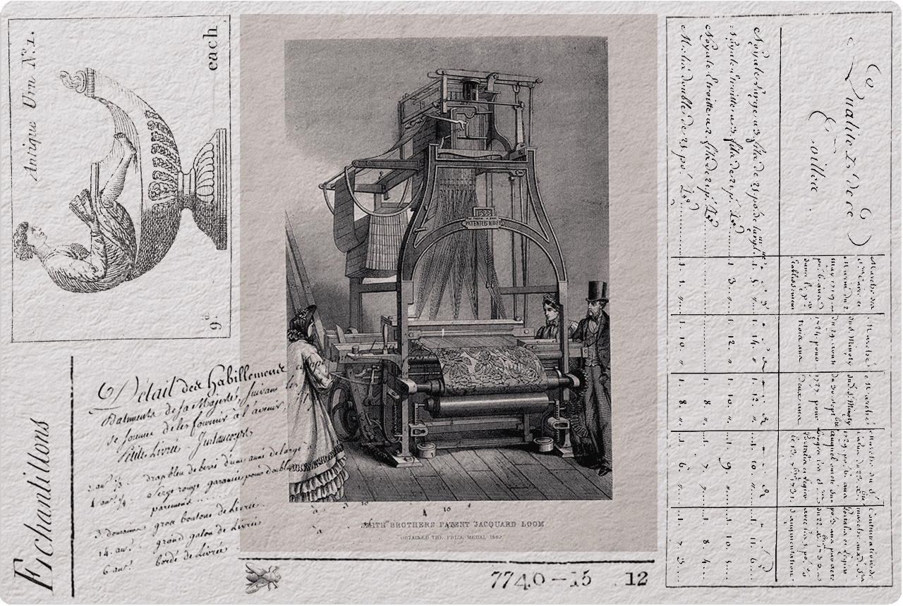 Le métier à tisser Jacquard est une véritable révolution dans l’industrie textile du XIXème siècle: avec l’automatisation et la reproductibilité des tissus, les coûts de production baissent significativement tout en ayant un impact sévère sur la main d’oeuvre du secteur.